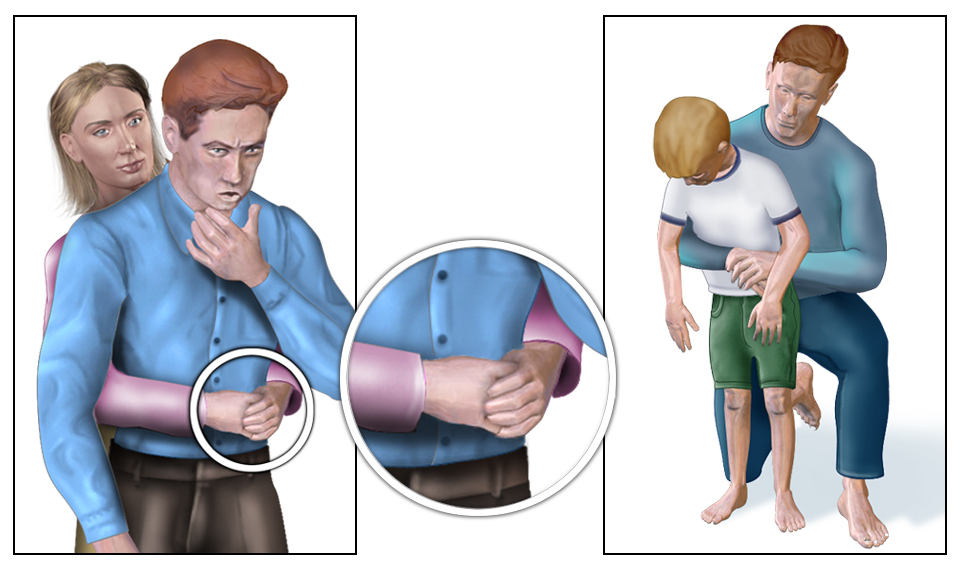 Tout d'abord, il faut donner 5 claques vigoureuses, main à plat, dans le dos de la victime. En cas d'échec, c'est la manœuvre d'Heimlich qui doit être pratiquée.