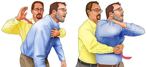 Tout d'abord, il faut donner 5 claques vigoureuses, main à plat, dans le dos de la victime. En cas d'échec, c'est la manœuvre d'Heimlich qui doit être pratiquée.